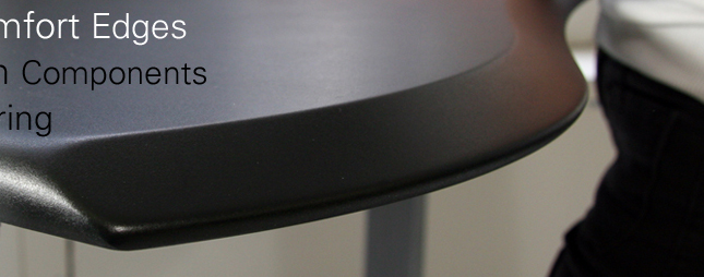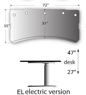Biomorph uses furniture grade blond Maple plywood. Edges are bullnosed and chamfered reveal facing the user. Finish is a baked-on catalyzed clear lacquer, semi-matte, non-glare finish Thickness is 3/4" or 1". Legs use linear actuators, sometimes from Linak. Shape: 72" x 35"-31" |